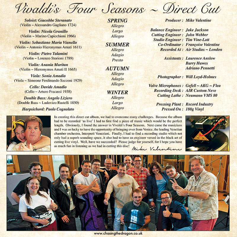 In creating this direct cut album, we had to overcome many challenges. Because the albumhad to be recorded "as live' I had to first find a piece of music which would be the perfectlength. Obviously,I found the answer in Vivaldis Four Seasons. Next came the musiciansand I was so lucky to have the opportunity of bringing over from Venice, the leading Venetianchamber orchestra, Interpreti Veneziani. Finally, I had to find a recording studio which notonly had a superb sounding space, it also had to have an engineer versed in the black art ofcutting live vinyl. Well, have we succeeded? Please judge for yourself, for I hope you havecas much fun in listening as we had in cutting this disc!
